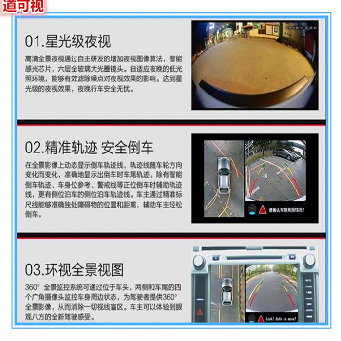 道可視1080P超清版360度全景行車輔助系統(tǒng)擁有更高的清晰度;軌跡線誤差小于5厘米;6大行車輔助功能,讓你行車更安全。我想大家不愿意遇到的就是當有些強行變道剮蹭到自己愛車后逃之夭夭,原本以為行車記錄儀可以拍攝到車牌號碼,結果取證時卻發(fā)現只剩一片模糊...分辨率低、夜晚拍攝能力差,取景角度太小這些問題一直都是不正規(guī)行車記錄儀為常見的問題,貪一時便宜有時候損失可是相當大的。