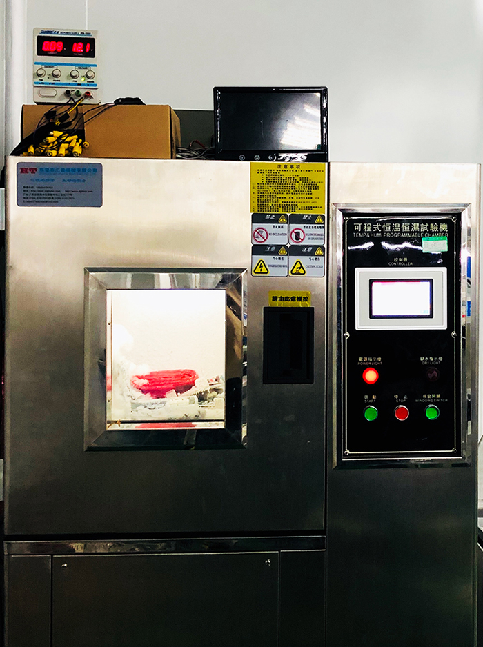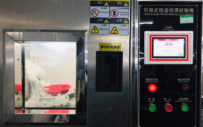 在道可視生產(chǎn)線眾多高科技的檢測工具中,不得不提可程式恒溫恒濕測試機。這臺機器24個小時全程處于開機狀態(tài),可以對機器的高低溫和耐濕度進行測試。在下圖中,道可視360°全景行車輔助系統(tǒng)的幾塊主板已經(jīng)放進了機器進行了幾天時間的測試,溫度設(shè)置在了﹣40℃,在如此惡劣的低溫條件下,測試機內(nèi)已經(jīng)結(jié)滿了冰霜,但道可視的主板卻依舊“頑強”的亮燈工作著。