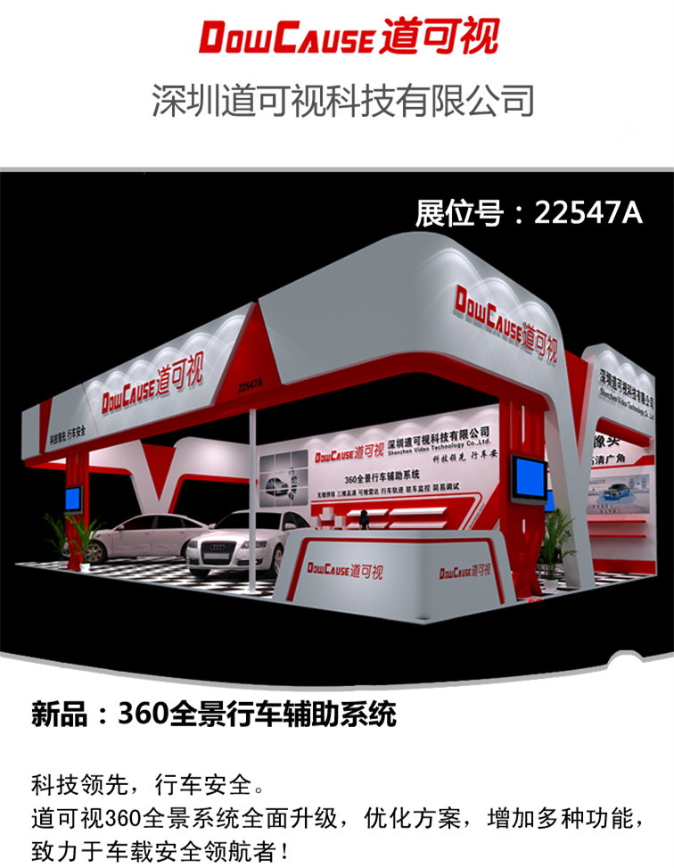 2015年1月16日,第十一屆深圳國際汽車改裝服務(wù)業(yè)展覽會盛大開幕,迎來了國內(nèi)各地的參展商和采購商。深圳道可視科技有限公司精心準(zhǔn)備的各種展品在展會現(xiàn)場獲得了市民以及采購商的一致好評。特別是我們的360度全景泊車影像系統(tǒng)備受關(guān)注,受到了各界人士的駐足。這一次我們主要的展品有360度全景泊車影像系統(tǒng)、智能倒車軌跡、專車專用攝像頭。這三類展品是我們公司專門針對汽車電子行業(yè)設(shè)計生產(chǎn)的主打產(chǎn)品,不僅在國內(nèi)屬于獨創(chuàng),在國際上也是具有較強競爭力。